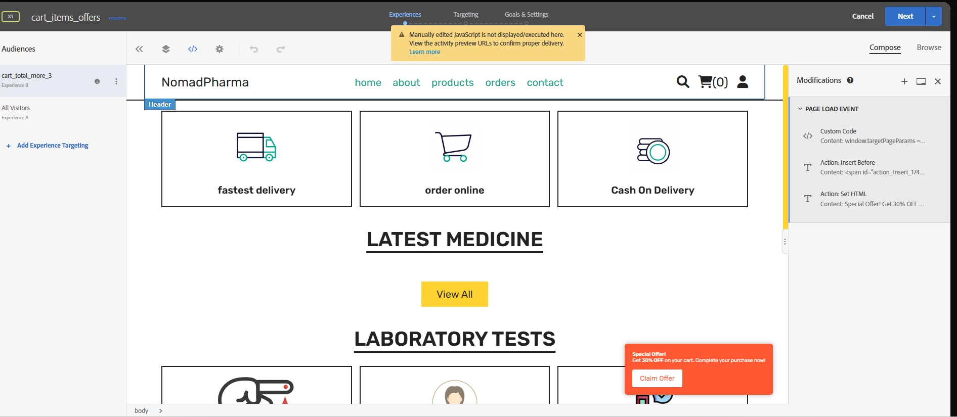 --- target segment(user who has cart items more than 3) added custom code in modification tab