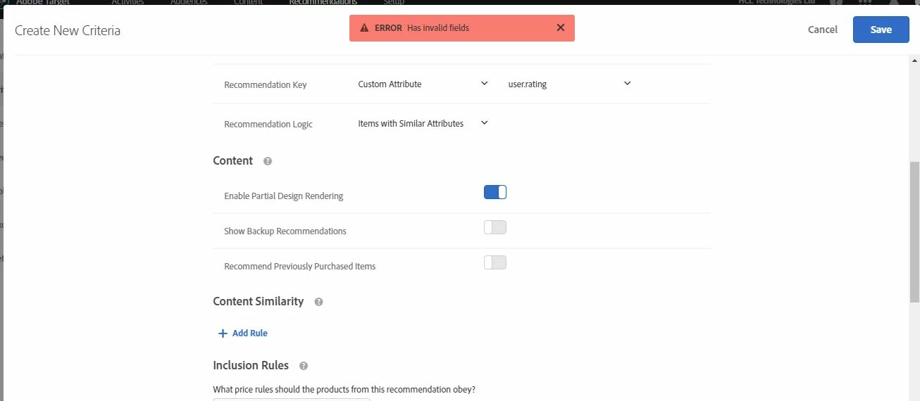 - When I try to save a criteria with a custom attribute key using logic of item with similar attribute, I get the error has invalid fields. Something that I am missing?