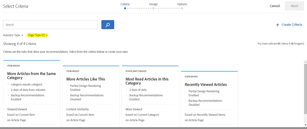 Hi! I am trying to create a recommendations activity to show recommended articles on a blog based on the article a visitor is currently on. My criteria is to look at the current category ID and show other articles w/ same category. I believe the best way to set this up would be an items with similar attributes algo, with current item as recommendation key and the content similarity using entity.category. When I create the activity, I am unable to find/select that criteria I created. In fact, out of the 59 criterias I have, I can only see 26 within the activity even though I've made sure the activity and criteria both use the article and category page types. Please assist, thanks!