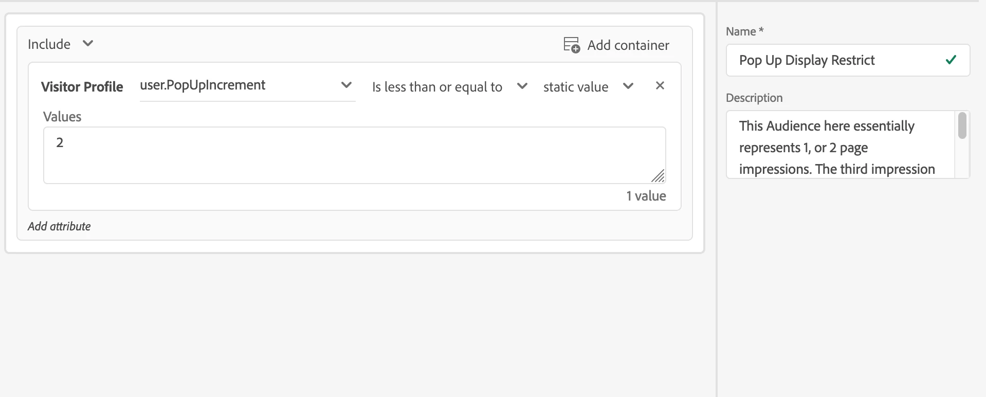 I have been wondering if there is a way we can reduce the frequency of pop-up Lightbox template appearance to user https://github.com/Adobe-Marketing-Cloud/target-experience-templates/blob/master/lightbox/template.html