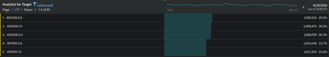 Example of the user-friendly format that the raw A4T values are classified into by Analytics. Remember, if you’re seeing an Activity ID in the Analytics for Target dimension, but never seeing that activity represented in the Target Activities & Target Activity > Experience dimensions and it’s been 24 hours since the activity launched, please contact Customer Care so they can manually reclassify that Activity’s A4T data.