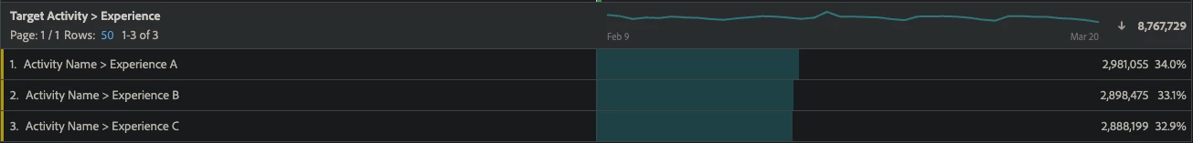 In reporting, this manifests by Analytics reporting that the Target activity does not appear to be behaving as it was authored to (e.g., a 50/50 split activity might show 60/40 or even more extreme discrepancy). In situations like this, Target is indeed delivering experiences as instructed, however, Analytics is not receiving the full picture in its reporting data. If you notice anomalous figures in your A4T data, please validate that SDIDs are being properly generated by Target and then are subsequently picked up by Analytics. You can also contact Client Care if you would like to get information about the overall level of unstitched hits coming from your account.