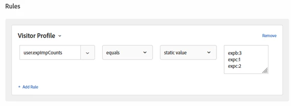 - Rule definition: Visitor Profile: user.expImpCounts > equals > expB:3, expC:1 or expC:2
