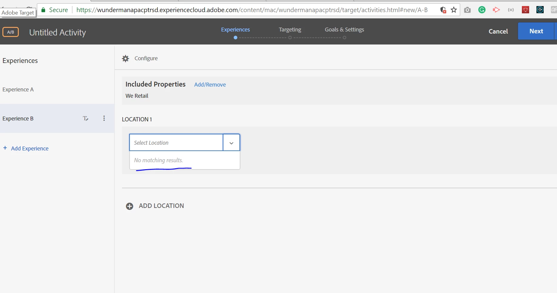 I am trying to set up A/B Testing in Adobe Target but when setting up location its showing no matching result in Location1 Box and Experience A.