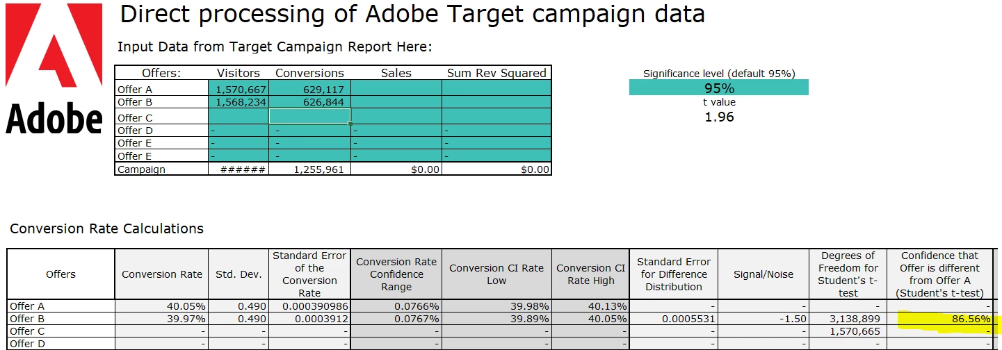 We are getting ready to share out test results and noticed that the confidence level % in Target is different than an Excel calculator that was downloaded from Adobe. Can anyone help me understand why those two calculations are different considering they are both calculated by Adobe? Excel version calculated confidence at 87% while Target calculates confidence at 57%.