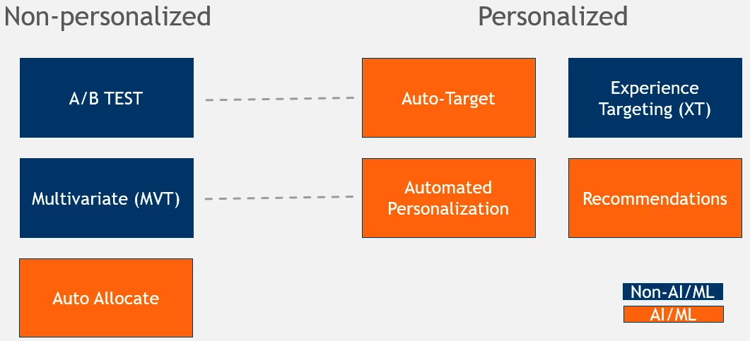 Adobe Target offers many different testing & personalization options. I’ve outlined them here, and separated them into several categories – Non-personalized vs. personalized and Non-AI/ML vs. AI/ML. Note that the categories can overlap. The dotted lines represent the corresponding Personalized/AI version of the non-personalized/non-AI category. So Automated Personalization is to Multivariate what Auto-Target is to A/B testing.