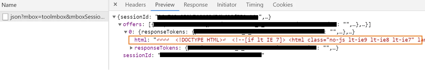 Below is an illustration of an HTML offer code as the response from a regional mbox 'toolmbox'.