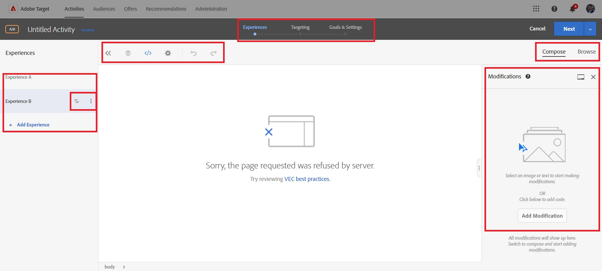 3. What are the steps to complete the Activity? (Experiences, Targeting, Goals & Setting)