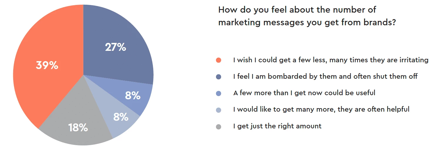 Two-thirds of consumers (66 percent) surveyed for the firm’s 2023 Consumer Marketing Fatigue survey want fewer marketing messages, and 27 percent feel they are bombarded by marketing messages.