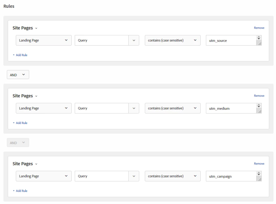 - starting audience: all visitors landing on a specific page, coming from adv campaign (i.e. utm_source, utm_medium and utm_campaign are present in query string and have a significant value)
