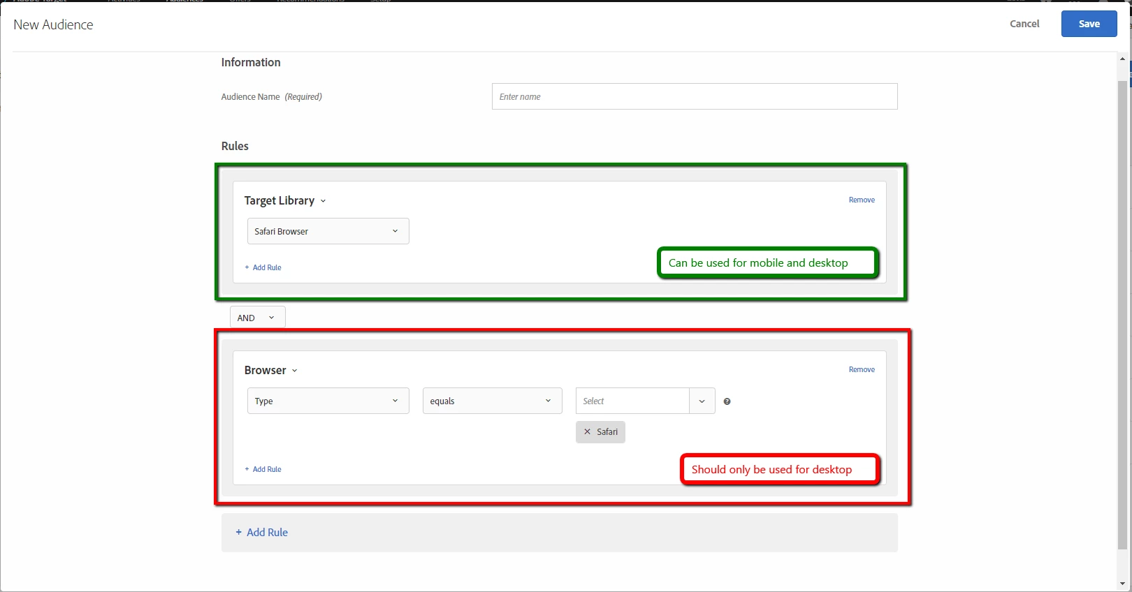 Issue: This is documented internally in TNT-30767 there are multiple ways to ask the Audience for Safari visitors one of the ways works for both mobile and desktop visitors and the other only works for desktop visitors. There is no indication in the UI of this known fact.