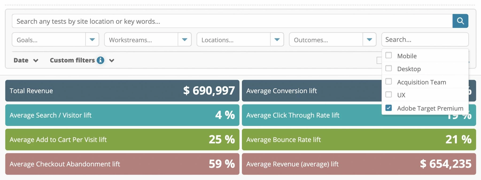 With Adobe Target, organizations have the tools they need to analyze individual tests. Organizations can go into Adobe Target and understand how the test impacts any metrics configured in Adobe Target. Lift, Confidence, segments, Success Metrics, etc…..all the great things you need to analyze an individual test.
