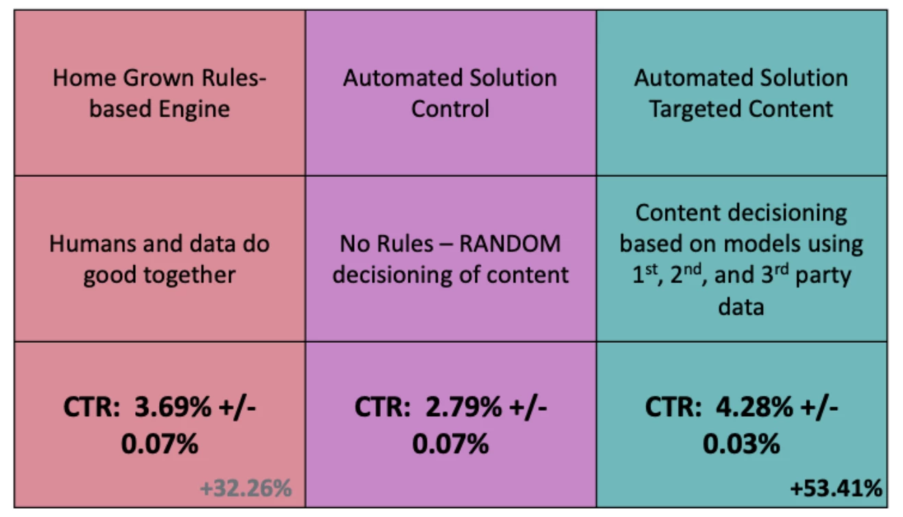In an ongoing effort to continue optimizing, they tested this solution against Automated Personalization (using strategies outlined in the above-mentioned playbook). This effort lasted more than six months and spanned dozens of iterations. Without going into the details, here were the high-level results: