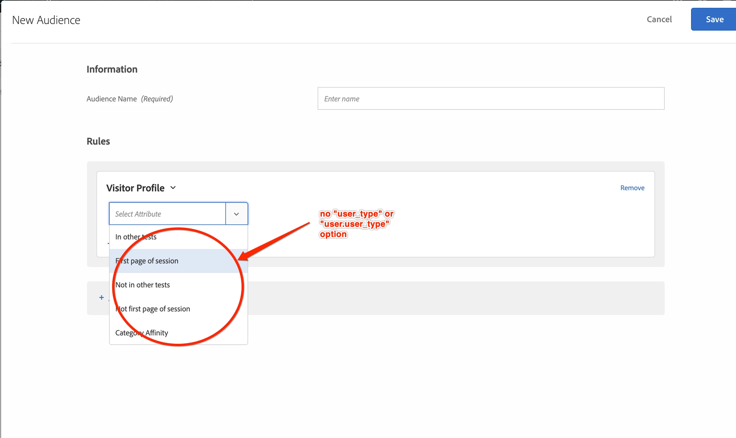 why i can't find [user attributes] in visitor profiels when i create an audience
