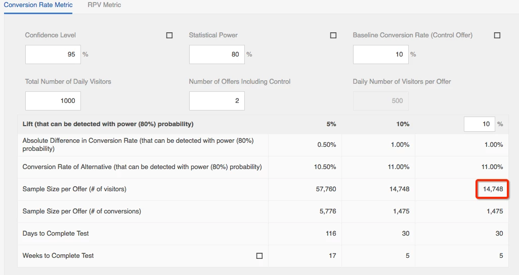 a sample size of 14,748 visitors to detect a lift of 10%.
