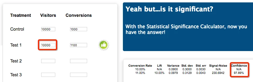 However, with 10,000 visitors per offer, you can detect a lift of 10% with a 98,89% Confidence Level.