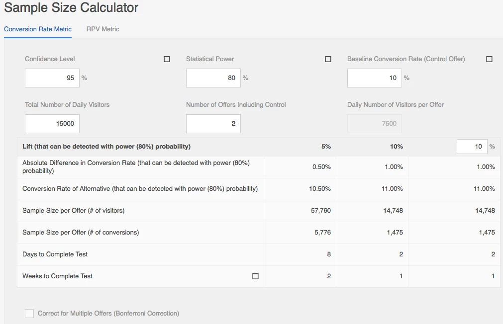 80% power, 95% Confidence level, baseline conversion of 10%, 2 offers, and 1000 daily visitors, the calculator says that you will need:
