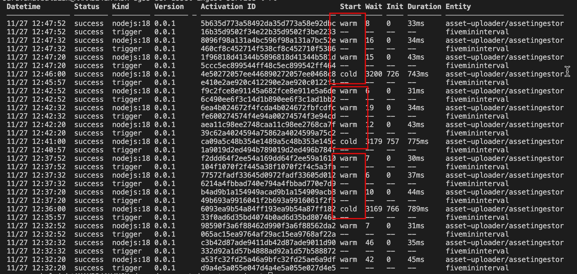 Here there is cold start for every 5 mins. After cold start, always there are 3 warm starts. Any given instance, 3 activation pods are running.