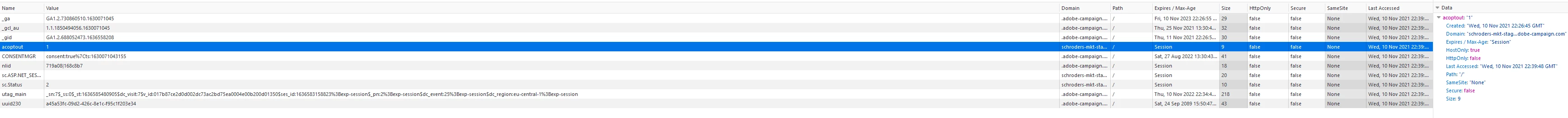 After a client clicks inside an email, the nlid, nllastdelid and UUID cookies are generated, and by accepting or rejecting the use of cookies, effectively, the acoptout cookie is generated with the given value according to the client's preference.