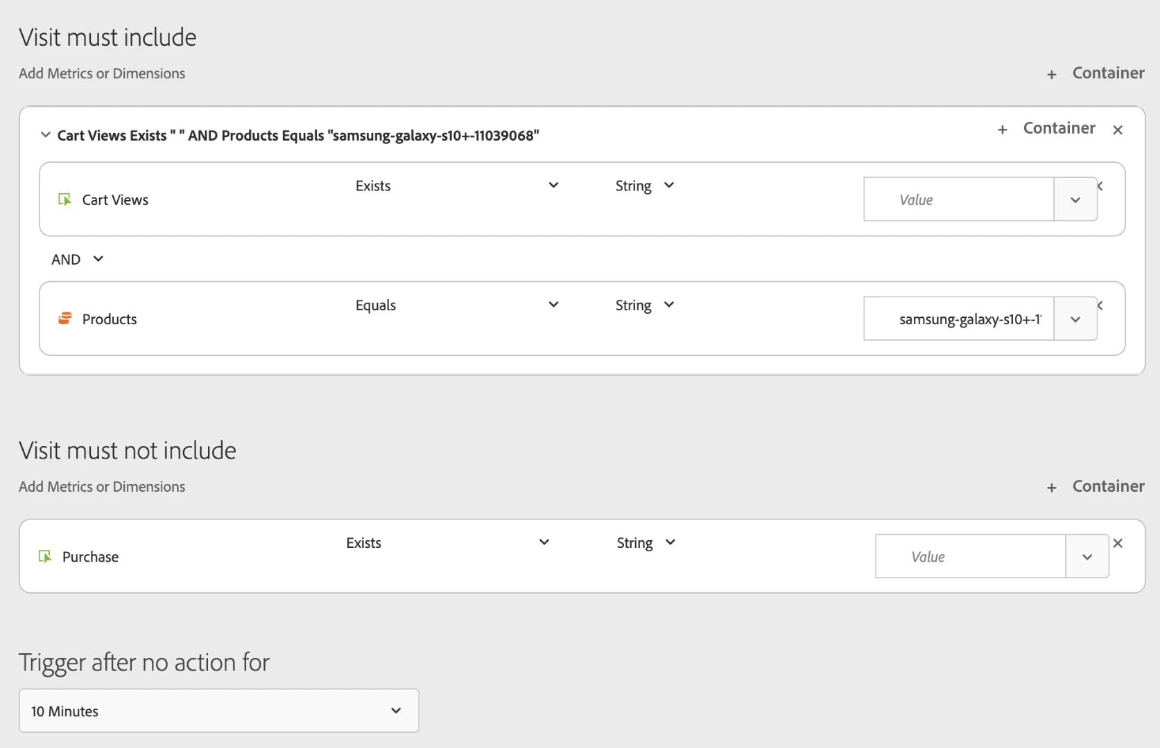 I've been playing around with the filter conditions and would like to set up a basic cart abandonment case where I want to make sure the user has viewed the cart with 1..n products (names taken from the analytics tracking request) but not purchased the product(s).