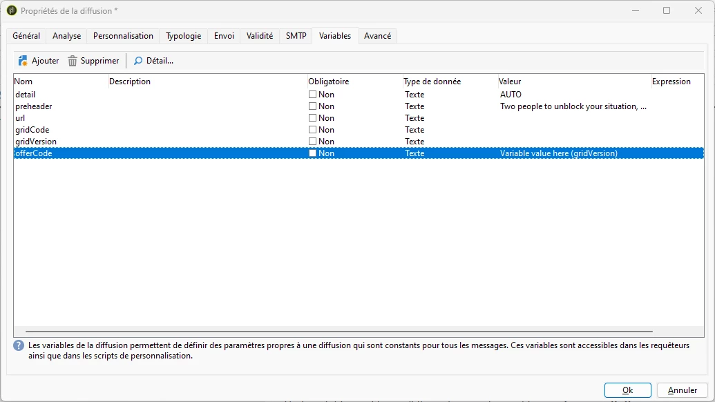 Let me explain, I would like my variable (which I am going to call gridVersion) to take the value of one of the fields in my recipient table, but I realize that in the delivery variables I cannot access the recipient table, nor even the temporary table (which would be ideal) as the values of my variable are "0","1" or "2", I thought of a ternary function but here too the conditions are made on the recipients table.