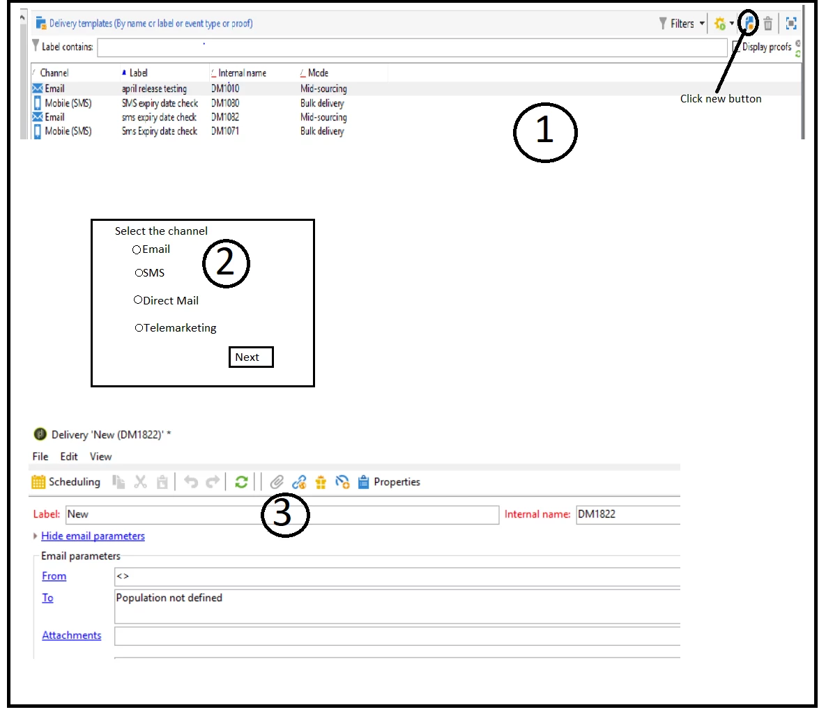 At present the flow is when click new button(1), directly (3) window opens. Instead of this when clicking the new button, (2) form should open. After selecting channel type it should go to (3).