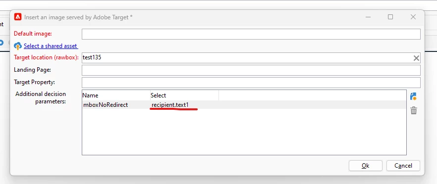 @michael_soprano , After adding all the parameters in 'Insert an image using Adobe target' window, click on Ok, and click on Source tab below and make the modification (go to source tab and search for &amp;mboxNoRedirect=<%= recipient.text1%>&amp;