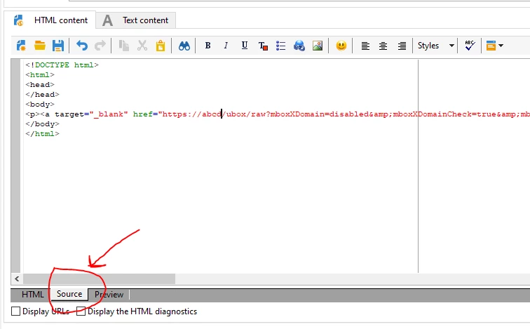 You can try this, select recipient.text1 as shown in the image, and go to source tab and search for &amp;mboxNoRedirect=<%= recipient.text1%>&amp;