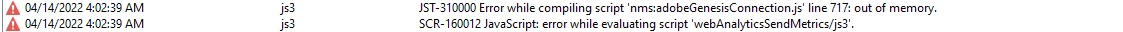 As always, I very much appreciate the past guidance/hints. This time I am trying to understand and learn how Adobe Campaign Classic passes data to Adobe Analytics as I started seeing errors in the "Sending of indicators and campaign attributes" technical workflow. The first error occurred in the "Sending campaign attributes" Java Script node. After stopping and restarting the workflow - it is scheduled / default time. The Java Script node failed a day later in "Sending Campaign Indicators" with JST-310000 Error while compiling script 'nms:adobeGenesisConnection.js' line 717 out of memory. It is worth mentioning that the workflow does not finish and does not pass on the data to Adobe Analytics. From my first impression, the JDK / compiler does not have enough assigned memory - would this be the case? If yes, where should I find the configuration and perform adjustments? Will this affect anything else. Nothing has changed / the same JDK version has been used, so I am unsure what is causing the issue. Please, see attached screenshot.