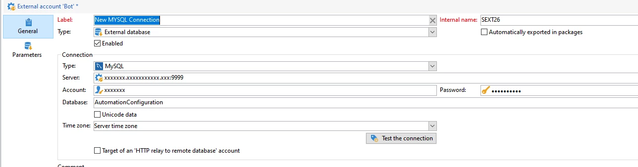 The connection is as follows (sensitive data removed).