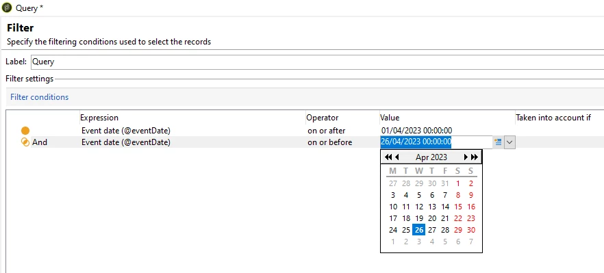 If you are trying to extract data in a workflow, then you can create query condition as below,