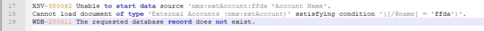 07/12/2021 10:12:20 query XSV-350062 Unable to start data source 'nms:extAccount:ffda *Account Name'.