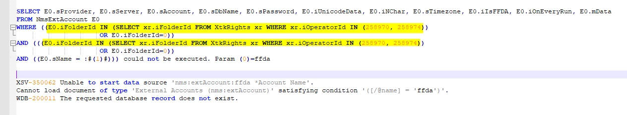 07/12/2021 10:12:20 query WDB-200001 SQL statement 'SELECT E0.sProvider, E0.sServer, E0.sAccount, E0.sDbName, E0.sPassword, E0.iUnicodeData, E0.iNChar, E0.sTimezone, E0.iIsFFDA, E0.iOnEveryRun, E0.mData FROM NmsExtAccount E0 WHERE ((E0.iFolderId IN (SELECT xr.iFolderId FROM Xtk