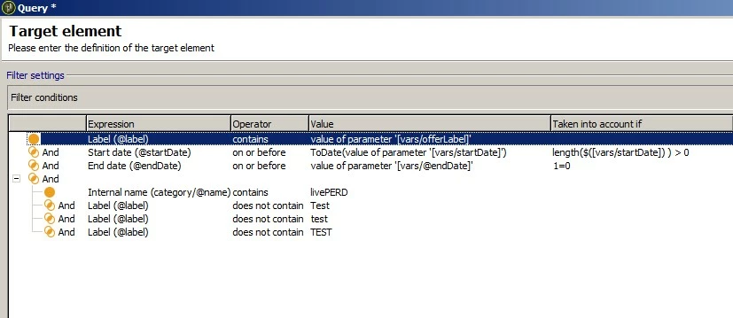 I am defining local variables and then using the query to filter by the defined variables. Searching by offer label works fine but start or end date throws the following error.