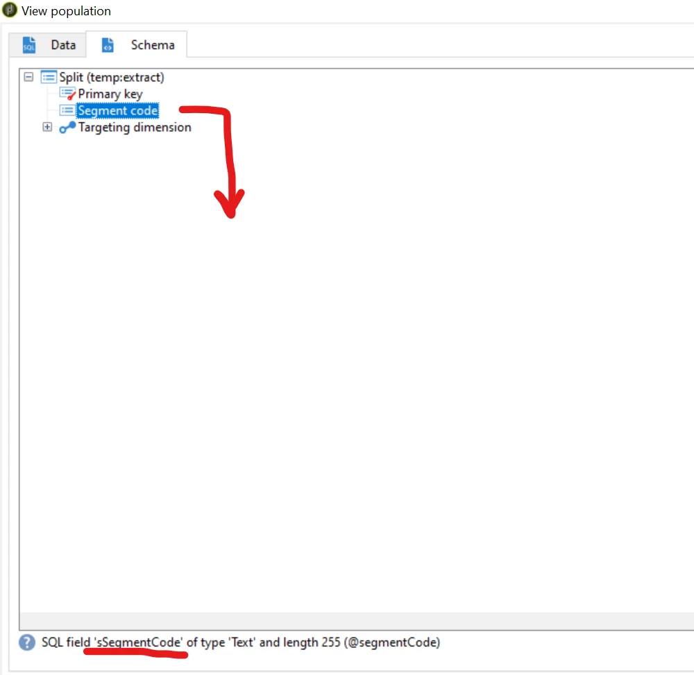 The SQL field names you want to add to the delivery can be found when you explore the population schema in your workflow.