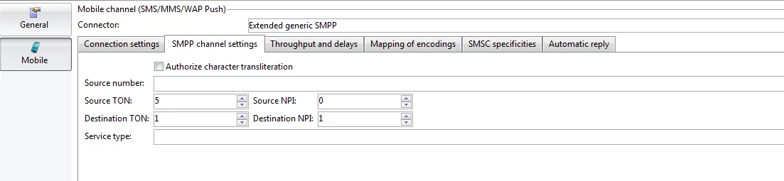 However you could consider the TON and NPI Settings in case the SMS Connection is being established with vendor through Extended Generic SMPP, see below Screen Shot: