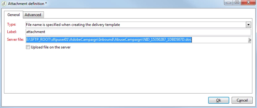 - Specified the access path of the file and its personalized name in the definition window (based on the customer name, it picks the respective file to attach).