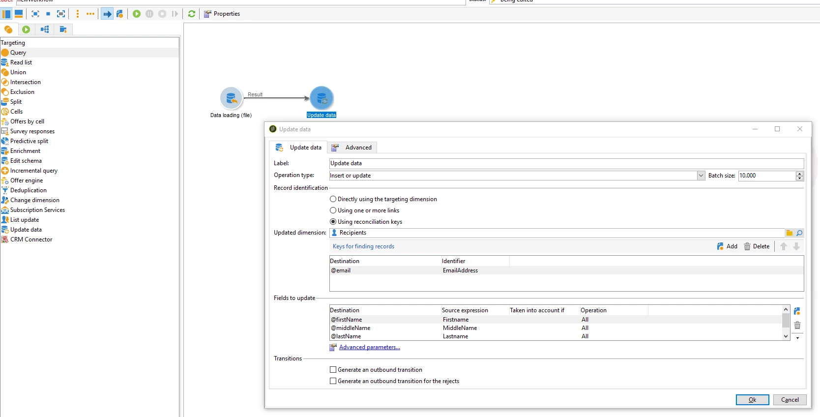 I have started with a data loading (file) activity in the workflow - and I am able to load the data from the CSV. The output from this activity belongs to a on-the-fly dimension temp:fileImport obviously generated by the import-Activity wizard. How do I proceed to pick Recipients in my Campaign database, based on the data in the import data?