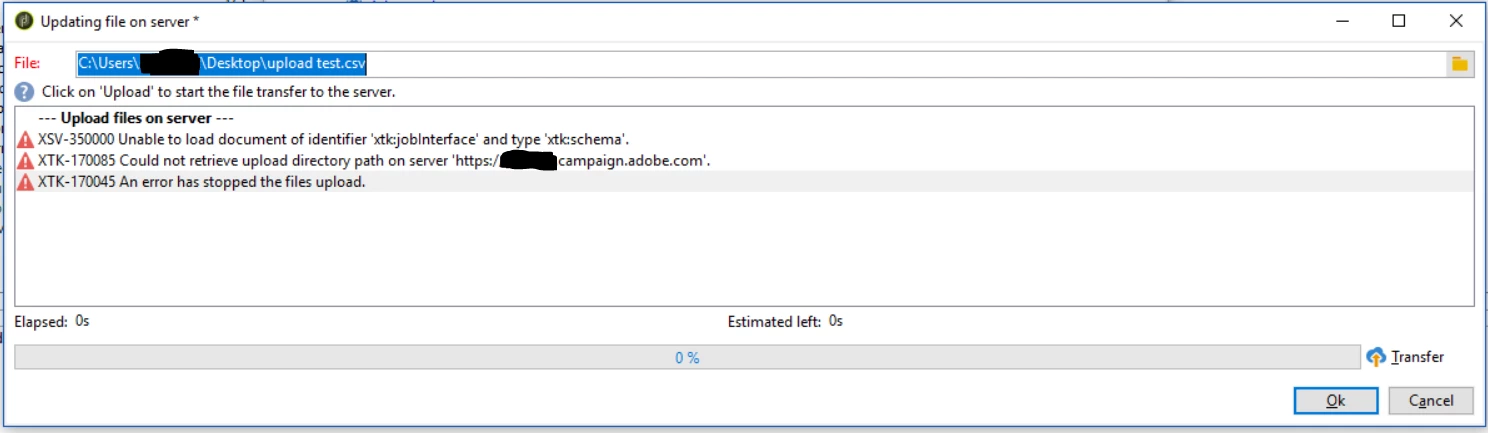 We have a 'Data Loading' activity in our workflow and when we tried to upload a CSV file from local to the server, we encountered the following error. What could be the cause and is this something we can fix?