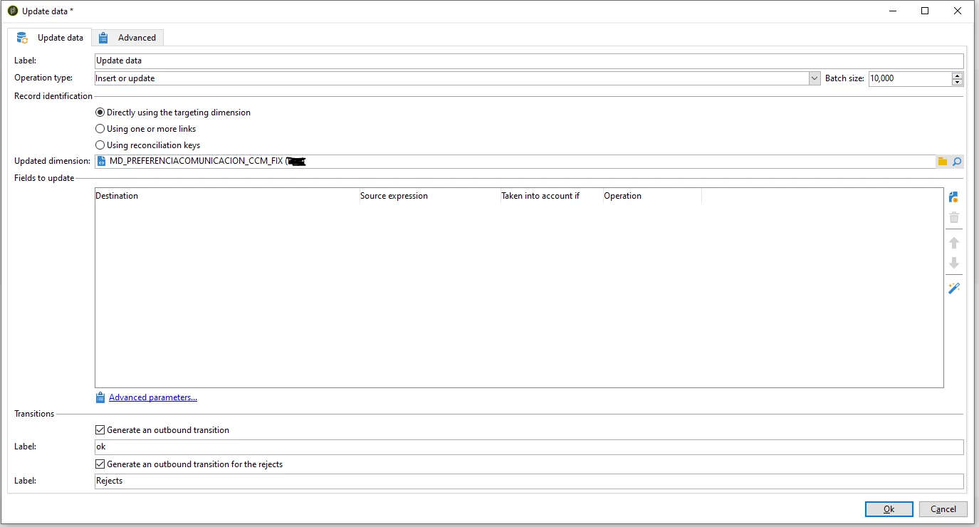 After saving and opening again the Update activity I've notice the "Updated dimension" changed from "MD_PREFERENCIACOMUNICACION_CCM_FIX" to MD_PREFERENCIACOMUNICACION_CCM".
