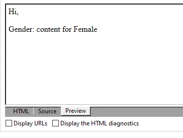 <P>Gender: <% if ( recipient.gender == 1 ) { %>content for Male<% } if ( recipient.gender == 2 ) { %> content for Female<% } %></P>