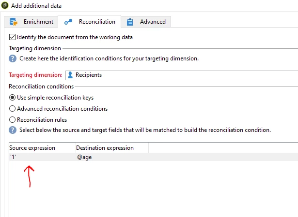 If we include "1" in the source expression when doing reconcilliation with a field in the destination table, what does that signify?