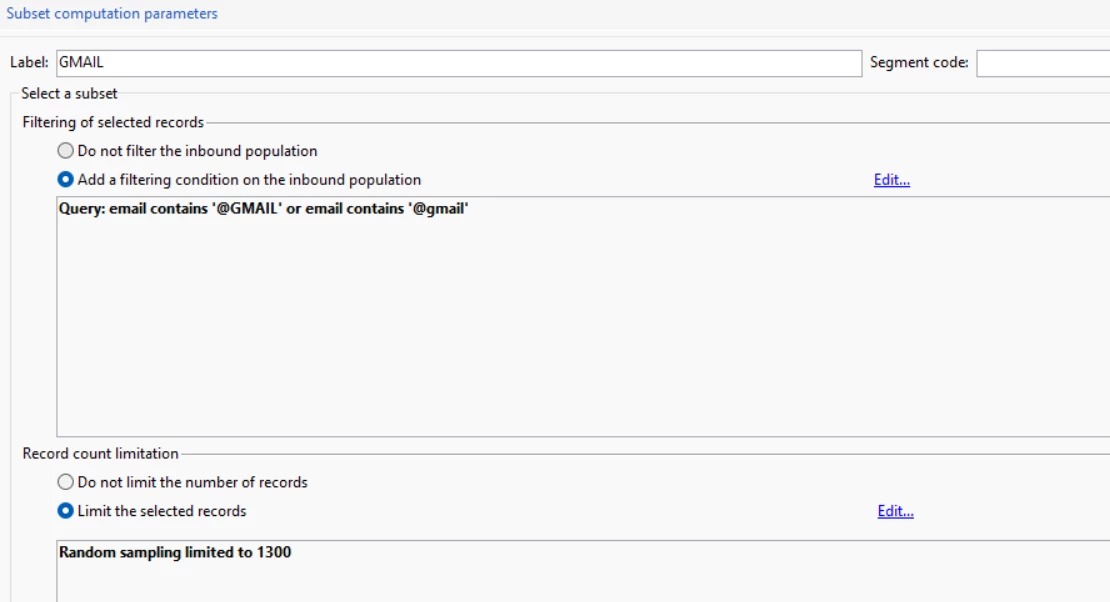 I have created the following split where, from a database of 79k users, I want to impact those ones who are from GMAIL (47k). The first impact has to be for 1300 users and for the next communication I want to impact 2000, but how can I ensure that Im not gonna send the next email to the ones I have sent before?