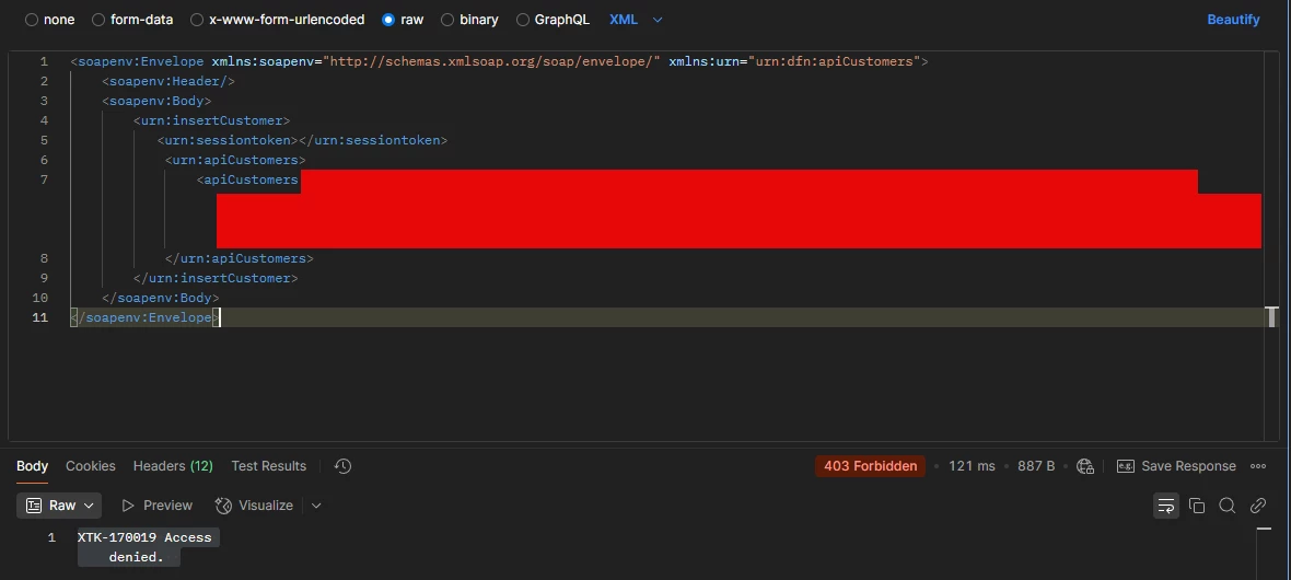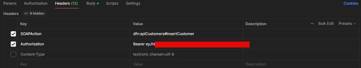 My SOAPaction is set to dfn:apiCustomers#insertCustomer, which is correct.