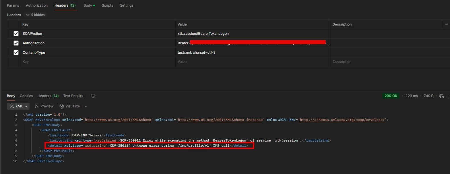 I'm trying to call the /nl/jsp/soaprouter.jsp by passing the Bearer token in the 'Authorization' header, but I keep getting 'XTK-170019 Access denied'.