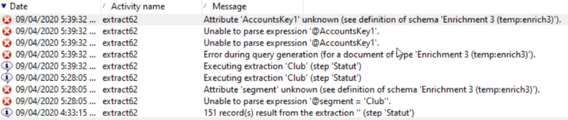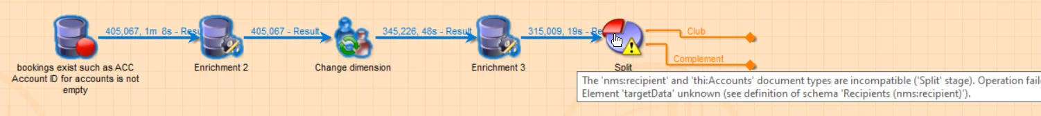 This happens especially when I load the delivery logs of the "Account" table, that I enrich and change dimension to the "Account "table. So far everything is fine but when I want to make a split using a variable of the "Account" table, I have this error message: Attribute AccountsKey1 unknow