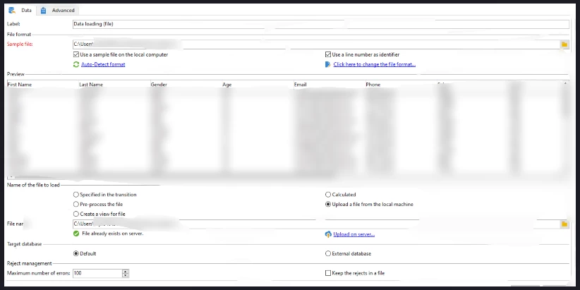 I had got error message while I am executing the Data loading (file) through an workflow. Tried changing various parameters like Name of the file to load to Pre-process the file and added <%= vars.filename %> but I had found no positive result. The error is shown as follows.