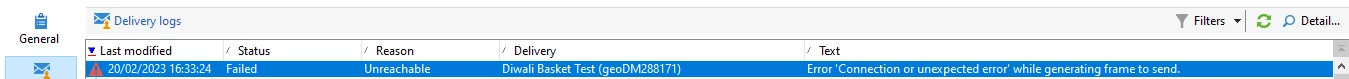Error:- 'Connection or unexpected error' while generating frame to send.