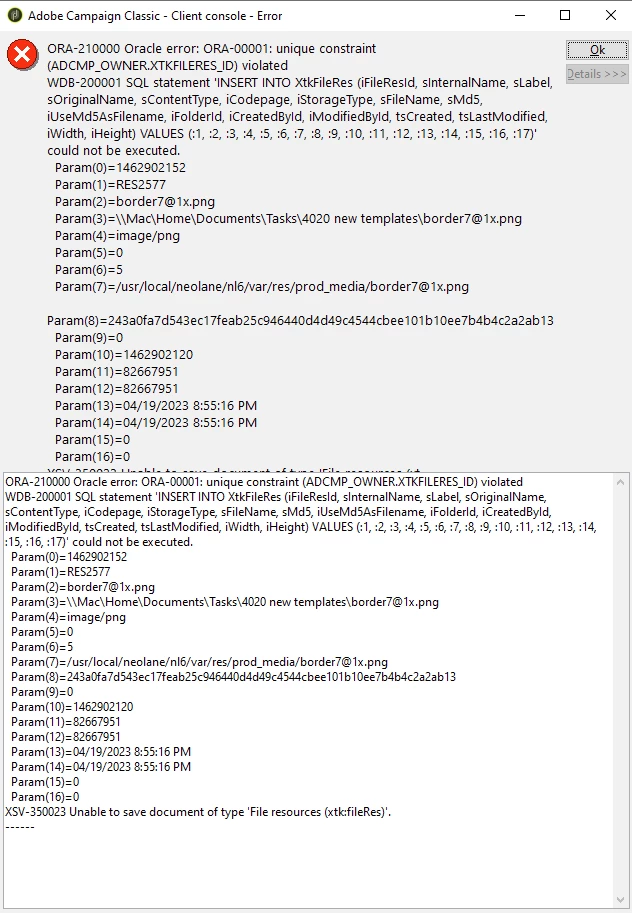 It seems that while there is a network issue in the backend, the records actually does get stored in the table XtkFileRes and upon clicking OK, the process retries the request and at this point the unique violation constraints is triggered as the record did get stored in the first place.