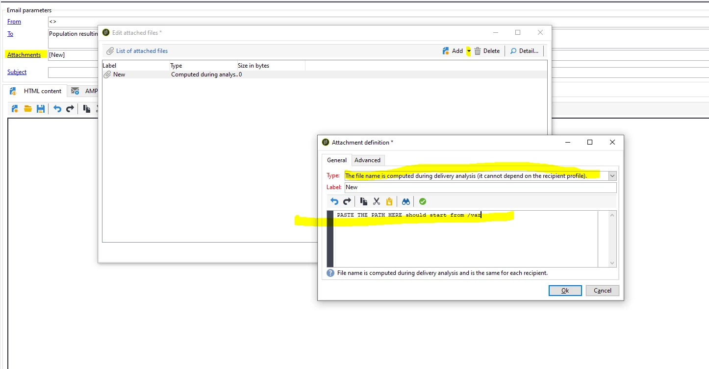 Steps on how to attach a calculated file: https://experienceleague.adobe.com/docs/campaign-classic/using/sending-messages/sending-emails/attaching-files.html?lang=en#attach-a-local-file